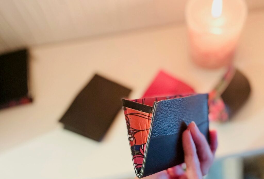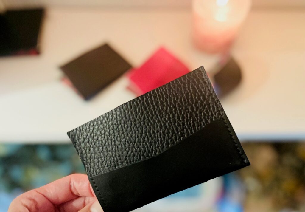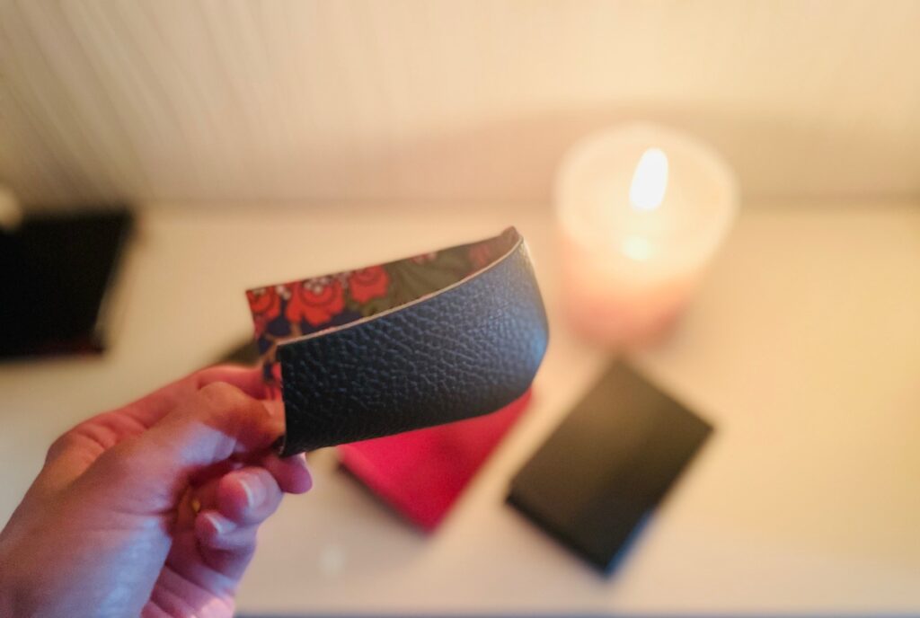 キレイに整ったデザインを求めて、革の厚みを変えて再度袋縫いに挑戦。※商品に出来ない端材を使用しています。