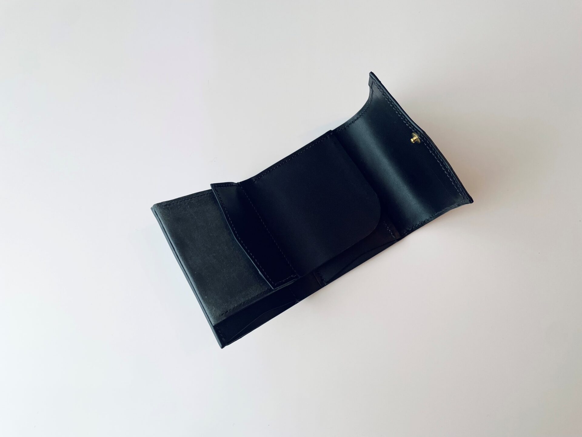 コロンとしたフォルムが特徴的な三つ折り財布です。